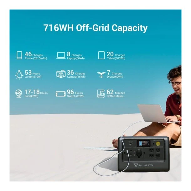Bluetti – EB70 Power Station 716Wh er velegnet til dig der leder efter en holdbar og pålidelig strømkilde, den kan klare selv de store strømbehov da den har en kapacitet på 716Wh. Med denne powerstation har du mulighed for at oplade alt fra din telefon, til fjernsyn til køleskab.Vær opmærksom på at det anbefales at oplade Bluetti – EB150 1500Wh Power Station hver 2. eller 3 måned for at forhindre fejl i batteriet.