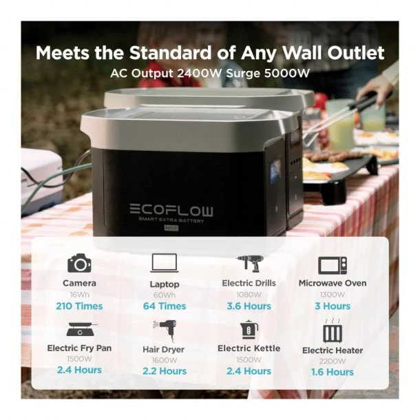 Med dette ekstra batteri vil du altid have en masse strøm on-the-go, da denne kan oplades samtidig med, at du oplader din Delta MAX powerbank uanset, om du oplader denne via. solceller, AC outlets, et køretøj eller EcoFlow’s Smart Generator.