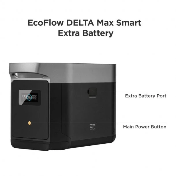 Delta MAX Smart Ekstra Batteri fra EcoFlow er et add-on batteri, som kan tilsluttes din EcoFlow Delta MAX Transportabel Powerbank for dobbelt løbetid. Hertil kan du endda tilføje op til to ekstra batterier for en total kapacitet på 6.048Wh.