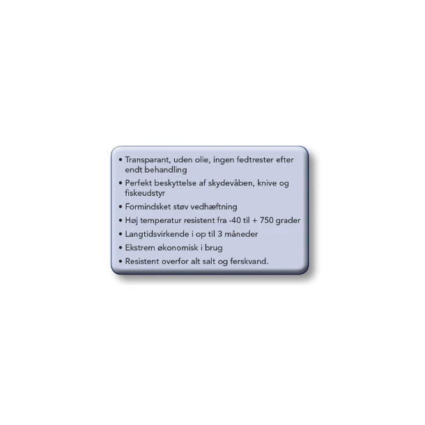 Coatingen har en fantastisk smørrende effekt og er nemt at tørre af, så man ikke efterlader rester. Coatingen giver en langvarig beskyttelse mod slidtage og korrision (rust). Coatingen er en kraftig keramisk belægning til både skydevåben, knive og fiskeudstyr og kan anvendes på alle overflader som f.eks. metal, aluminium, plast, gummi, lakeret træ mv. Coatingen kan anvendes på alle våbnets overflader, bl.a. løb, repetermekanismer mv. - Microfiberklud: