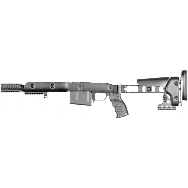 Dette skæfte er skræddersyet til lange afstande og liggende skydning. Fremstillet i hårdt anodiseret T6 6082 aluminium med kompositgreb og sidepaneler. Balancen på dette skæfte er fantastisk. Designet, så rekylen er så lav som muligt samt fremragende rekyl-absorbering som giver bedre præcision. Udstyret med alle skinner, slyngeophæng, enten et 5- eller 10-skuds magasin og selvfølgelig justering på træklængde, kindpude og bagkappen med rekyldæmpers højde.