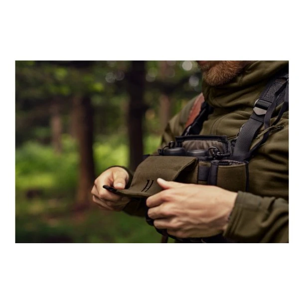 Nyheden Deer Stalker Bino Strap fra Härkila sørger for med dens selesystem at kikkerten ikke bevæger sig under en aktiv jagt. Bino Strap’en har to muligheder, kikkerten kan sidde beskyttet i tasten, men man kan også tage tasken af og sætte kikkerten fast i selen over brystet. Derudover har kikkerttasken en lille lomme til evt. telefon eller et lille kort, og den lukkes med en lydløs magnetlukning.