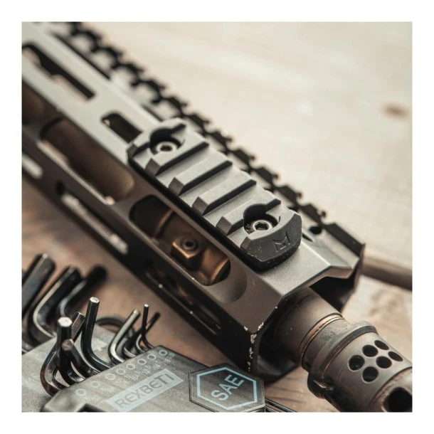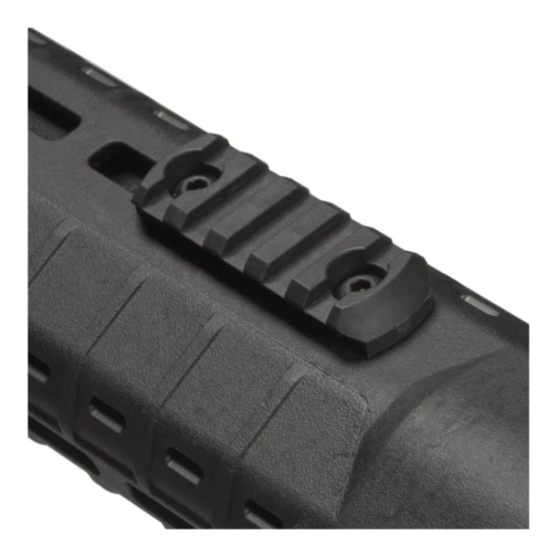 Magpul – M-LOK Polymer Rail Section 5 Slots fra Magpul er designet til brug med alle M-LOK kompatible håndbeskyttere og forends samtidig med, at den tillader fastgørelse af forskellige 1913 Picatinny tilbehør såsom lys, vertikalt greb m.m. Produktet er fremstillet af Mil-Spec-anodiseret aluminium, og den har skrå ender, som skal reducere hak og skarpe hjørner/kanter. Produktet er knap 8,5 cm.