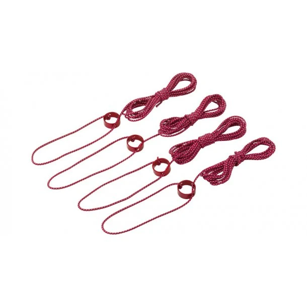Dette sæt indeholder 4 barduner á 2,4 meter, samt 4 bardun-strammere i ring-design hjælper dig med at justere og stramme barduner på dit telt let og uden at binde knuder. Fås i to størrelser, hvor den lille leveres som 4 pak, men den store leveres som 2 pak.