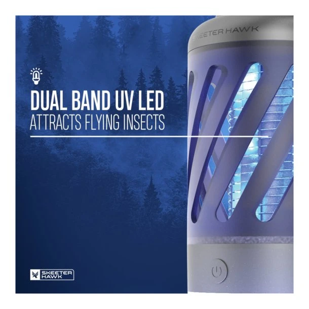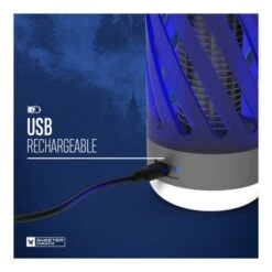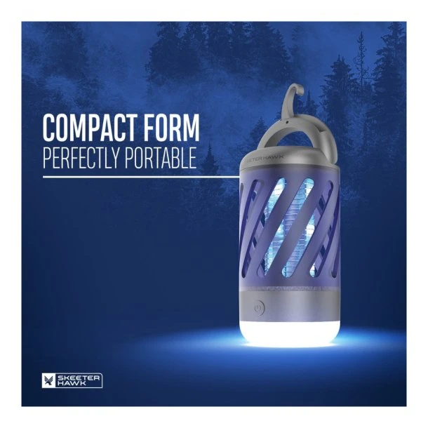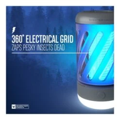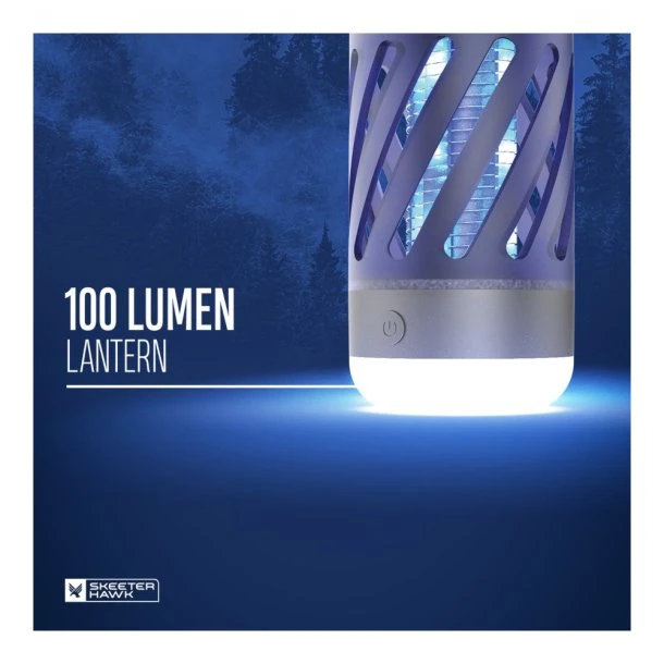 2-i-1 Insektlampe + Lanterne 100 Lumen fra Nebo bruger UV teknologi til at lokke myg og andre flyvende insekter ind, hvor de bliver stødet af en 360graders elektrisk rist. Produktet fungerer – som navnet antyder – også som en lanterne, som giver fint lys i mørket ved campingbordet. Modellen her er udviklet med et lille håndtag, så den er nemmere at transportere og hænge op.