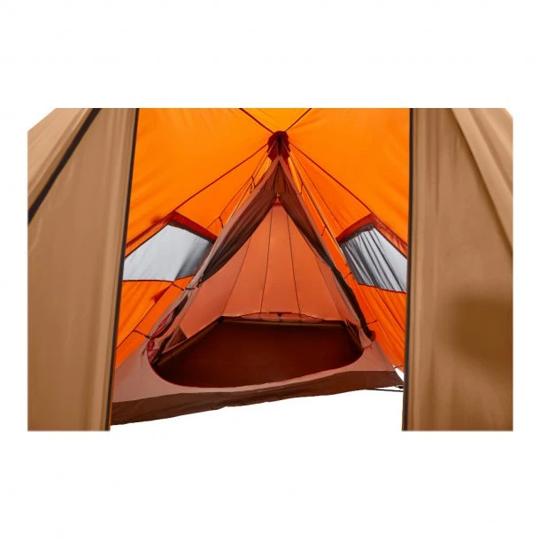 Net vinduer, stor dør og bundventilation bagerst i teltet giver tilsammen mulighed for et godt indeklima, så kan man bruge mange timer i teltet, hvis det skulle være dårligt vejr på turen. Teltet er også tilgængeligt i en større størrelse.