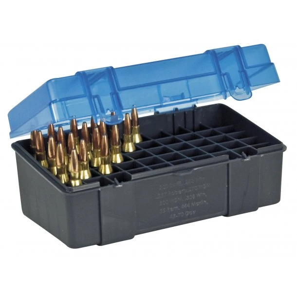 Patronæske til riffelpatroner med kapacitet til 50 patroner. Fremstillet i solid plast. Kasserne kan bruges til mange forskellige kalibre. Se herunder for den komplette liste.