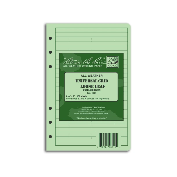 All Weater papir med 6 huller, der passer til Tactical Field Ring Binder. Samme papirtype, som i Tactical Field Book og Tactical Nootbooks. Papiret er ternet, hvor de lodrette linier er stiplet, hvilket gør papiret perfekt både til noter og skitser.