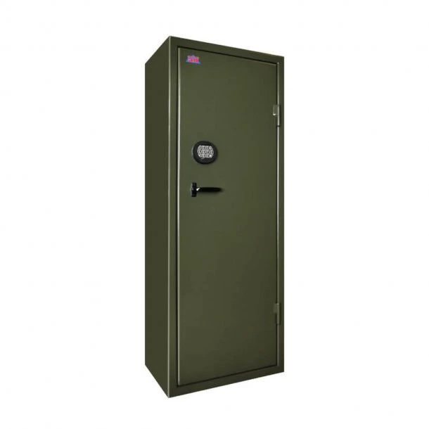 SP88 Våbenskab med Kodelås (Grøn) fra Scandinavian Safe er fremstillet med plads til 9 våben og med kodelås. Stiger i begge sider af skabet muliggør hylder fra top til bund. Kan også bruges til opbevaring af fotoudstyr og bærebare computere. Flytbar tophylde, 5 hylder i dør samt nøglekroge medfølger. Skabet findes også i en version med nøglelås. Sidepanel med 2 hylder medfølger. Våbenskabet er godkendt af Danske Forsikring og Pension og SS4392 standard. Våbenskabet sendes med fragtmand direkte fra leverandøren.