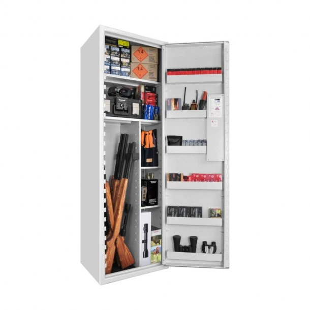 SP88XL Våbenskab med Kodelås fra Scandinavian Safe rummer plads til 9 våben, der kan stå adskilt og sikkert på samme tid i medfølgende holdere. Våbenskabet er fremstillet med plads til opbevaring af ammunition, kikkert og andre genstande. Derudover har våbenskabet indvendige stiger i begge sider, hvor ekstra hylder kan monteres fra bund til top. Våbenskabet har 2 flytbare tophylder, 5 faste hylder samt en liste med nøglekrog i døren.