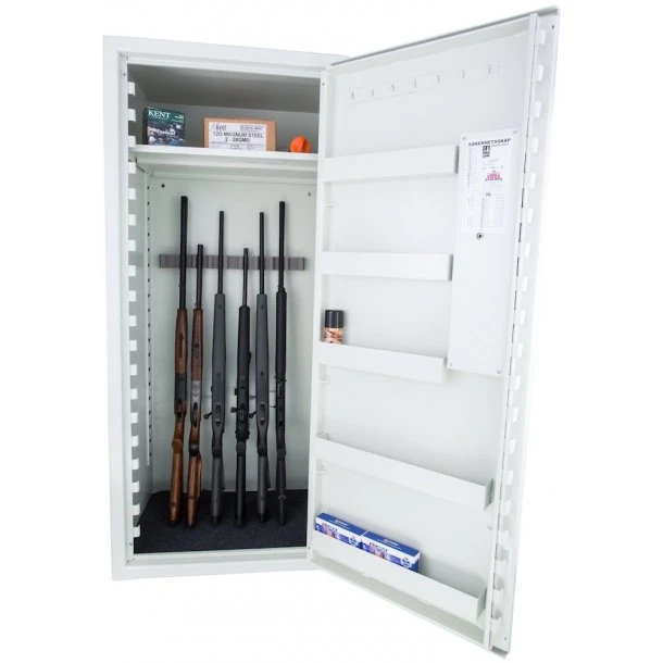 Våbenskab med plads til 16 våben. Stiger i begge sider af skabet muliggør hylder fra top til bund. Kan også bruges til opbevaring af fotoudstyr og bærebare computere. Flytbar tophylde, 5 hylder i dør samt nøglekroge medfølger. Skabet findes også i en version med kodelås. Våbenskabet er godkendt af Danske Forsikring og Pension og SS4392 standard. Våbenskabet sendes med fragtmand direkte fra leverandøren.