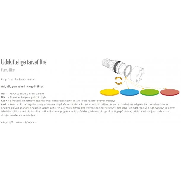 Farvefilter fra danske Suprabeam som passer til Q3 Defend stavlygten. Nem at sætte på og bruge. Vælg farve efter ønsket effekt. Kan bl.a. bruges til jagt, forbedret nattesyn, identifikation af kropsvæsker, mm.