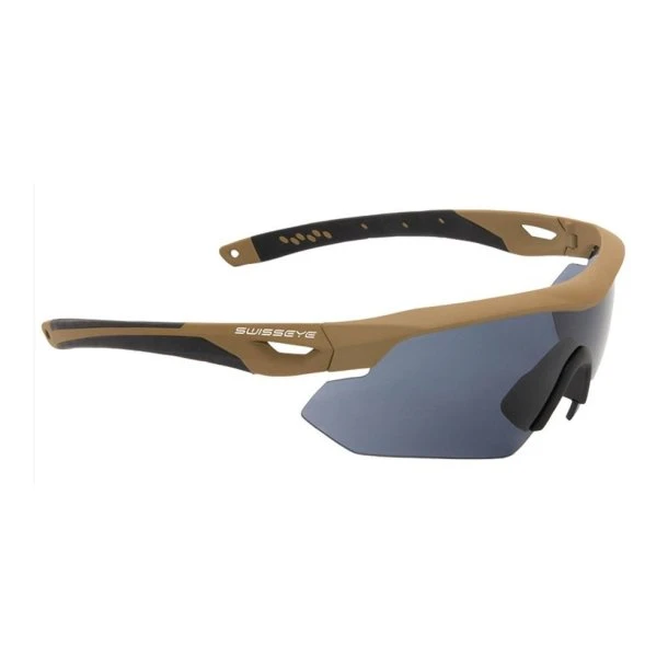 Tactical Swiss Eye Solbriller fra Swiss Eye er et par lette beskyttelses solbriller, som er udviklet med 100% polycarbonat linser og bløde, flade brille templer for øget komfort – også ved brug af akustiske høreværn. Solbrillernes linser er fremstillet med anti-dug og anti-ridse belægning for længere levetid og øget holdbarhed.
