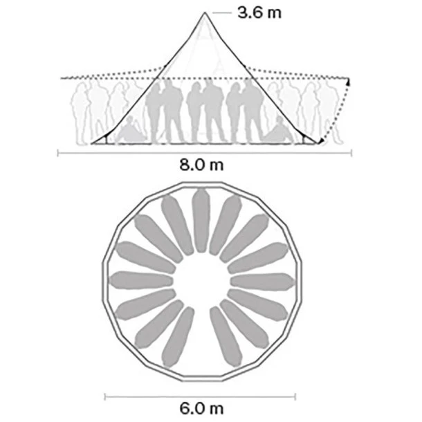 Denne lavvu fra Tentipi er perfekt til større arrangementer. Zirkonflex 15 CP kan åbne siderne op, så der bliver meget mere plads inde under og anvendeligheden bliver meget større. Åbnes alle siderne op kan der sidde op til 40 personer under dugen ved borde og der er ligeledes mulighed for blot at åbne nogen af siderne. Det er muligt at have en brændeovn eller åben ild i lavvuen, hvis man blandt andet skal grille eller blot have varmen omkring et bål. Kan rejses på blot 5 min.