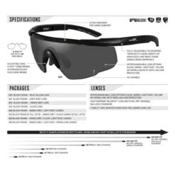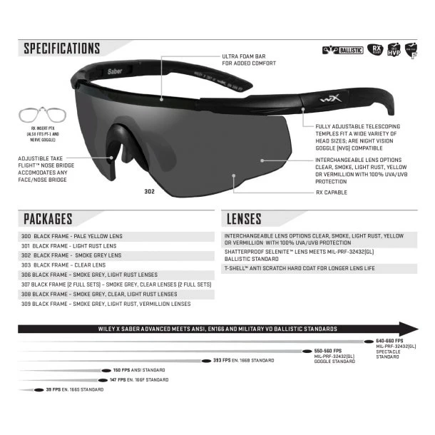 Den nye Wiley X Saber Advanced med 1 stk linse i Vermillion, som overholder alle krav for MIL-PRF-31013 militære ballistiske standarder, samt industriens ANSI Z87.1-2003 certificering. Disse briller er fremstillet med en solid 3,0 mm tyk linse, som er en af de mest holdbare linser til rådighed på markedet for taktiske briller.