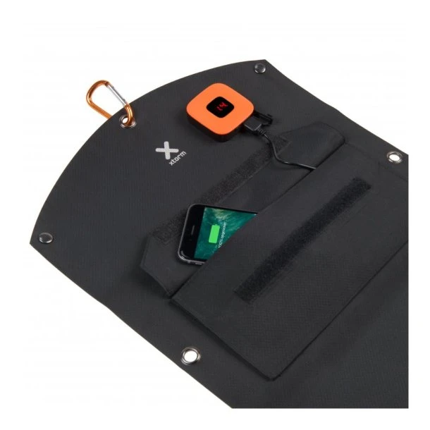 Solarbooster panelet er udviklet i et praktisk design med karabinen inkluderet, hvorfor du nem kan fastgøre den på din rygsæk, telt eller cykel, når du er på tur. Når du er færdig med at bruge den, så kan du bare folde den sammen og tage den med dig, og den er udviklet af stærke, fleksible og vandtætte materialer.